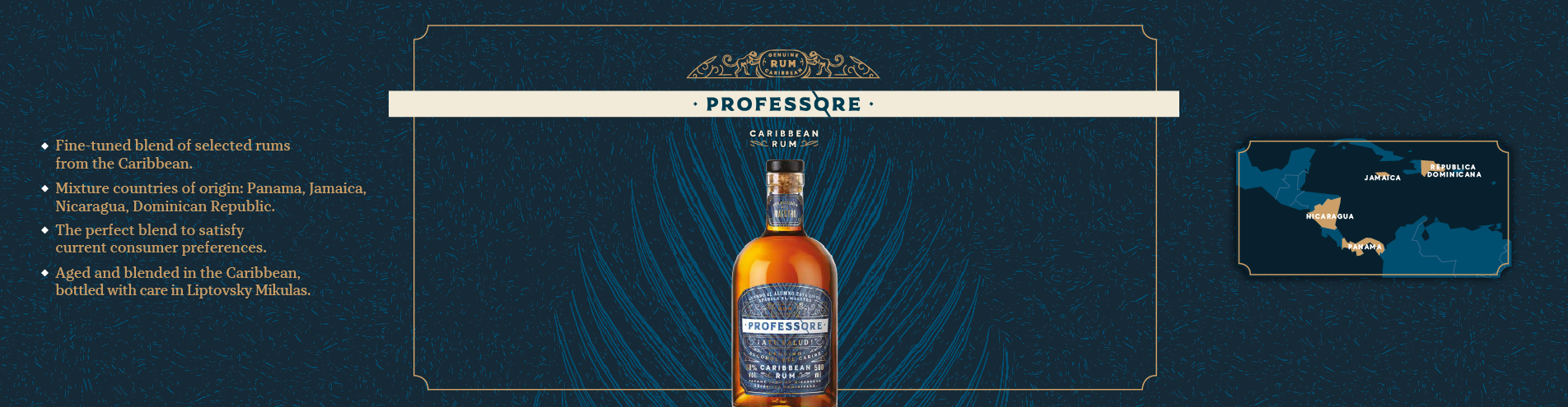 Creating a new rum is not easy, especially for a Central European. Central America is not a walk through the supermarket. You need a guide. A guy who knows his stuff and takes you gringo under his wing. My teacher was Ruíz. Professore is a fine-tuned blend of selected aged rums from the Caribbean region. Country of origin of rums included in the mixture: Nicaragua, Panama, Jamaica, Dominican Republic.