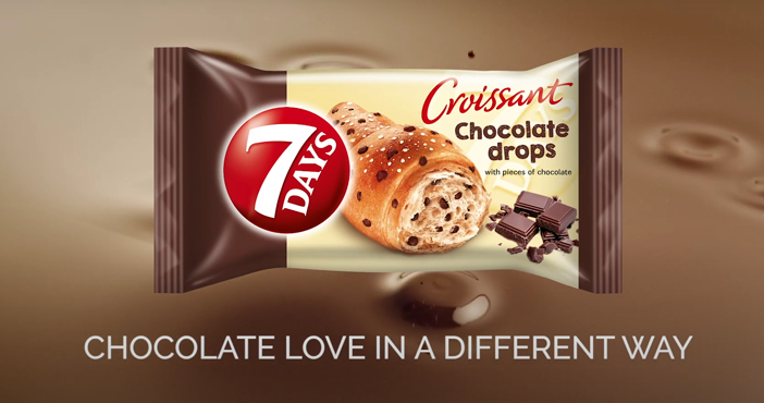 New 7DAYS Croissant Choco Drops. Real chocolate drops in a fluffy layered dough, kneaded with care, baked with love, sprinkled with sugar. A delicious combination for all!