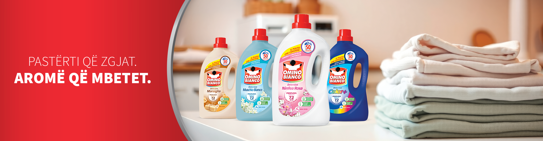 Developed in 1954, Omino Bianco has always been synonymous with clean and fresh laundry. Over the years, the brand has expanded its product range to include additives, pre-treatments, liquid whiteners, bleaching products, stain removers and colour-catching sheets as well as liquid and capsule detergents.